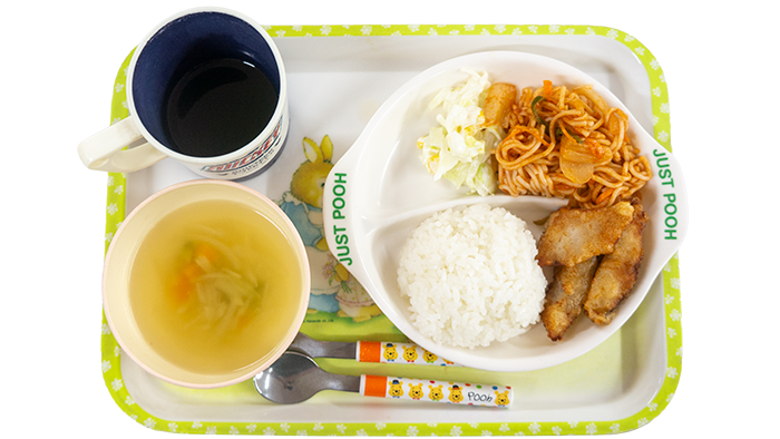 10月3日のお給食 2025 10/03 給食 今日の献立は白身魚フライ、イタリアンスパゲティ、キャベツとコーンのマヨ和え、ごはん、コンソメスープです。 幼児さんクラスの盛り付けです 乳児さんクラスの盛り付けです アレルギー対応メニューです 給食 10月2日のお給食 10月6日のお給食