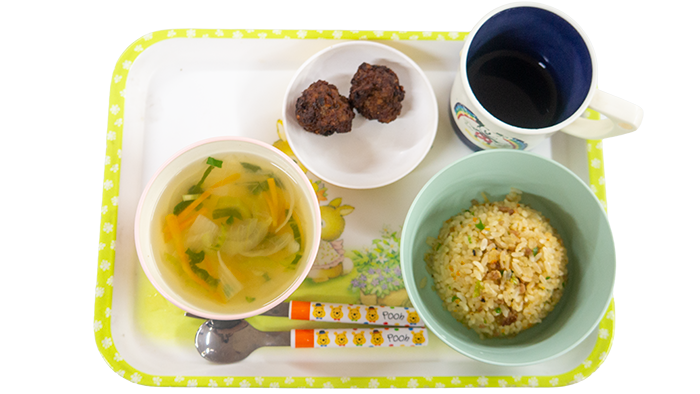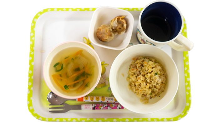 今日の献立はスタミナチャーハン、ミニ春巻き、青梗菜と春雨のスープです。