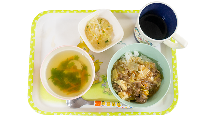 今日の献立はすき焼き丼、きゅうりと春雨の酢の物、水菜と竹輪のすまし汁です。