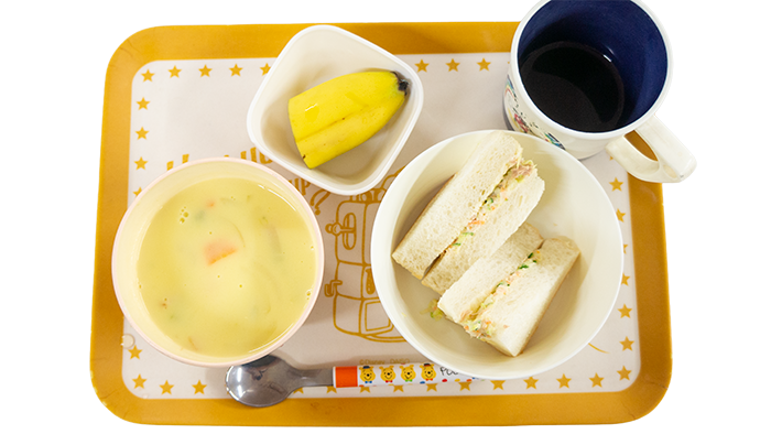 12月3日のお給食 2025 12/03 給食 今日の献立はツナサンド、コーンチャウダー、バナナです。 幼児さんクラスの盛り付けです 乳児さんクラスの盛り付けです アレルギー対応メニューです 給食 12月2日のお給食