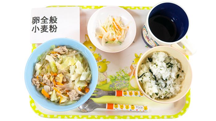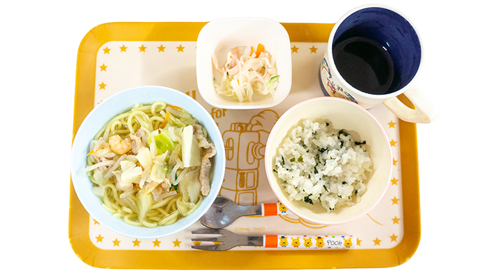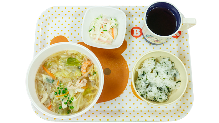 今日の献立は長崎ちゃんぽん、わかめごはん、大根サラダです。