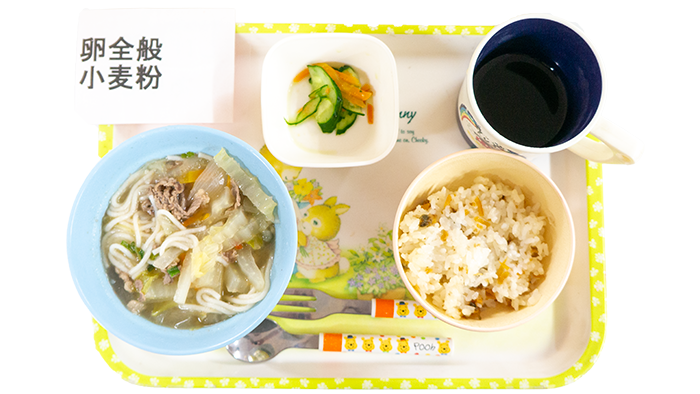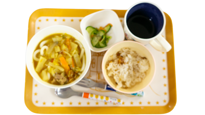 1月13日のお給食 2026 1/13 給食 今日の献立はカレーうどん、あさりごはん、きゅうりとにんじんの浅漬けです。 幼児さんクラスの盛り付けです 乳児さんクラスの盛り付けです アレルギー対応メニューです 給食 1月9日のお給食 1月14日のお給食