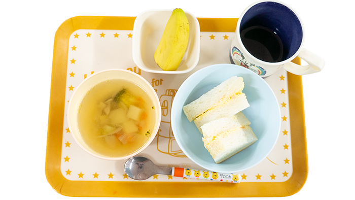 1月28日のお給食 2026 1/28 給食 今日の献立は玉子サラダサンド、牛肉とキノコのスープ、バナナです。 幼児さんクラスの盛り付けです 乳児さんクラスの盛り付けです アレルギー対応メニューです 給食 1月27日のお給食 1月29日のお給食