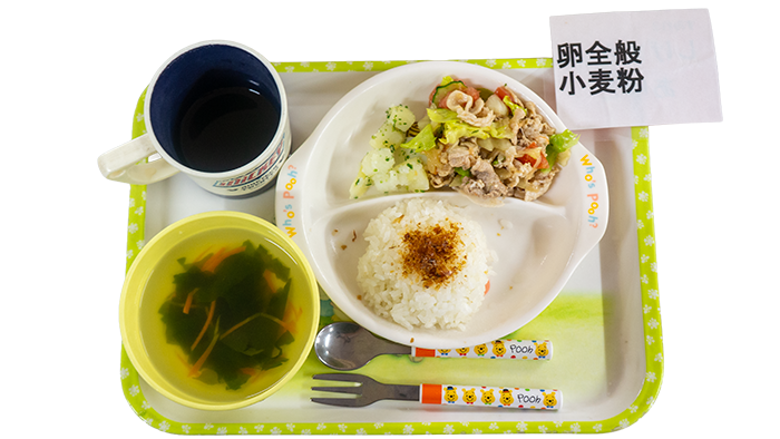 2月13日のお給食 2026 2/13 給食 今日の献立は豚しゃぶサラダ、粉ふき芋、ふりかけご飯、玉子スープです。 幼児さんクラスの盛り付けです 乳児さんクラスの盛り付けです アレルギー対応メニューです 給食 2月12日のお給食