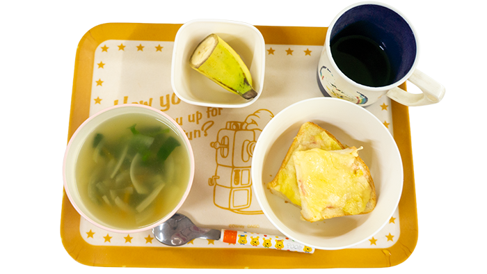 2月18日のお給食 2026 2/18 給食 今日の献立はベーコンポテトトースト、ほうれん草とパスタのスープ、バナナです。 幼児さんクラスの盛り付けです 乳児さんクラスの盛り付けです アレルギー対応メニューです 給食 2月17日のお給食