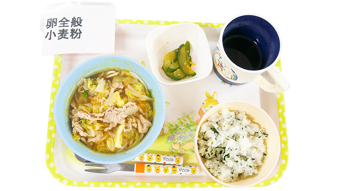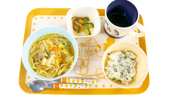 今日の献立はカレーラーメン、わかめご飯、中華きゅうりです。