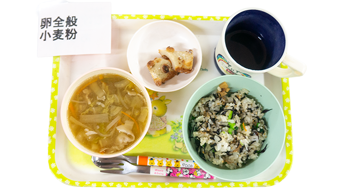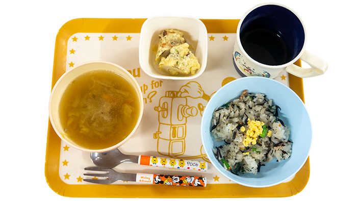 2月27日のお給食 2026 2/27 給食 今日の献立はひじきと小松菜のまぜご飯、竹輪の磯辺揚げ、豚汁です。 幼児さんクラスの盛り付けです 乳児さんクラスの盛り付けです アレルギー対応メニューです 給食 2月26日のお給食