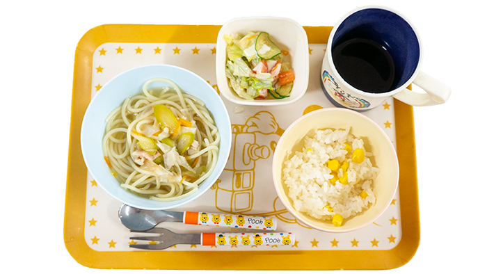 今日の献立は和風スパゲティ、コーンライス、グリーンサラダです。
