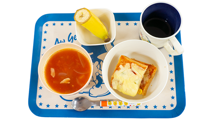 今日の献立はピザトースト、ミネストローネスープ、バナナです。