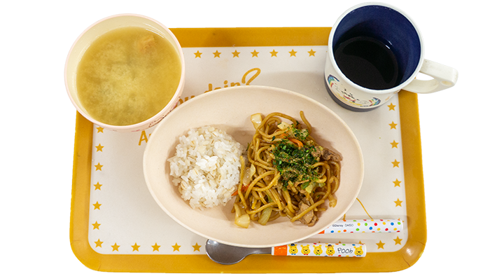 今日の献立は焼きそば、麦ごはん、小松菜と厚揚げの味噌汁です。