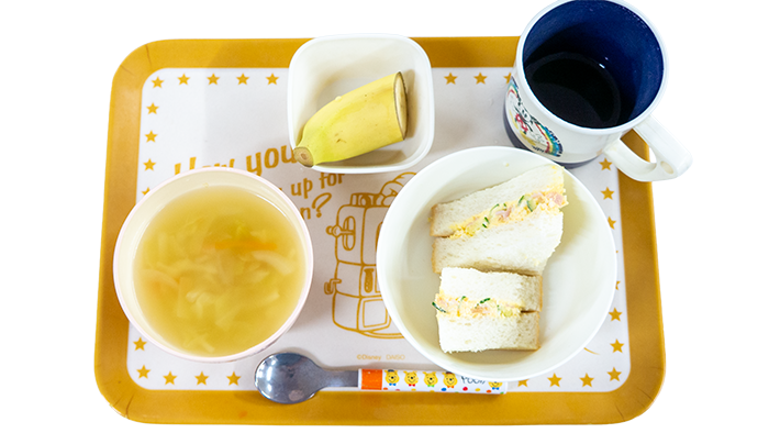 今日の献立は玉子サラダサンド、キャベツとパスタのスープ、バナナです。