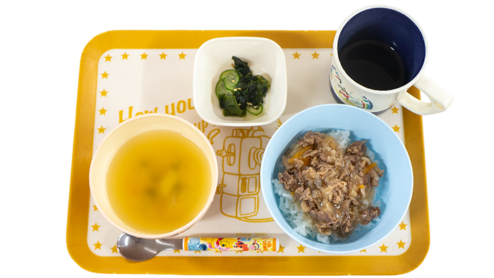 4月23日のお給食 2026 4/23 給食 今日の献立は牛丼、きゅうりとわかめの酢の物、じゃがいもと玉ねぎの味噌汁です。 幼児さんクラスの盛り付けです 乳児さんクラスの盛り付けです 給食 4月22日のお給食