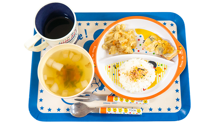 4月24日のお給食 2026 4/24 給食 今日の献立は鮭のマヨネーズ焼き、切り干し大根の煮物、ふりかけご飯、おふと水菜のすまし汁です。 幼児さんクラスの盛り付けです 乳児さんクラスの盛り付けです 給食 4月23日のお給食