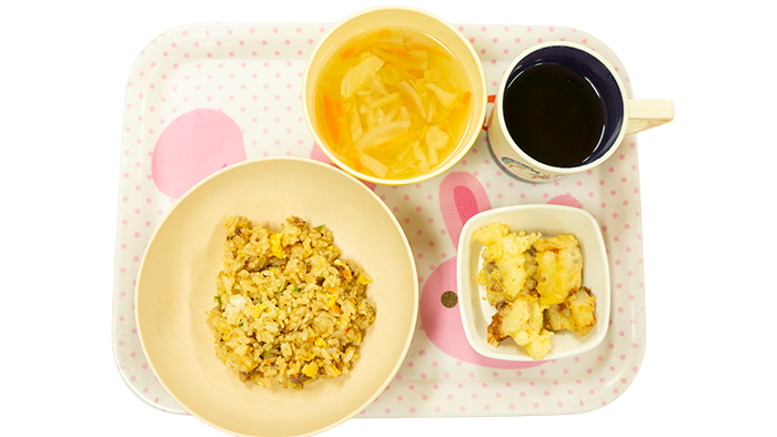 今日の献立は牛肉と玉子のチャーハン、キャベツと春雨のスープ、竹輪のチーズ揚げです。 幼児さんクラスの盛り付けです 乳児さんクラスの盛り付けです アレルギー対応メニューです