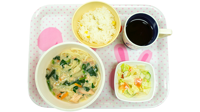今日の献立は鮭とほうれん草のクリームスパゲティ、コーンライス、グリーンサラダです。 幼児さんクラスの盛り付けです 乳児さんクラスの盛り付けです アレルギー対応メニューです -