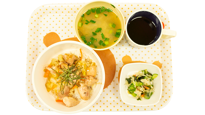 今日の献立は焼き鳥丼、もやしとちくわの酢の物、小松菜と厚揚げの味噌汁です。 幼児さんクラスの盛り付けです 乳児さんクラスの盛り付けです -