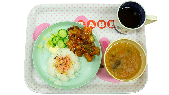 今日の献立は酢豚、温野菜、ふりかけごはん、白菜とコーンのスープです。 幼児さんクラスの盛り付けです 乳児さんクラスの盛り付けです アレルギー対応メニューです -