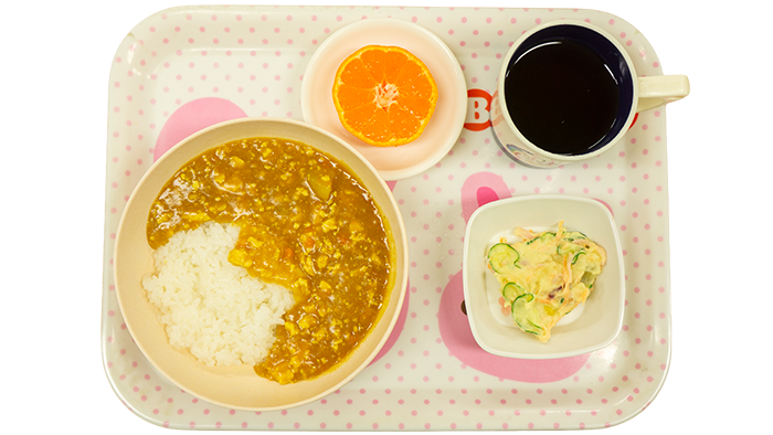 今日の献立は豆腐カレー、スイートポテトサラダ、みかんです。 幼児さんクラスの盛り付けです 乳児さんクラスの盛り付けです アレルギー対応メニューです -