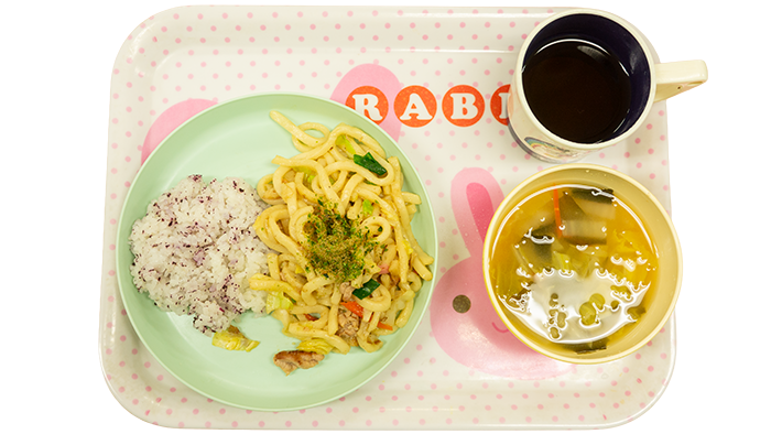 今日の献立は焼うどん、ゆかりごはん、白菜と人参の甘酢和えです。 幼児さんクラスの盛り付けです 乳児さんクラスの盛り付けです アレルギー対応メニューです -