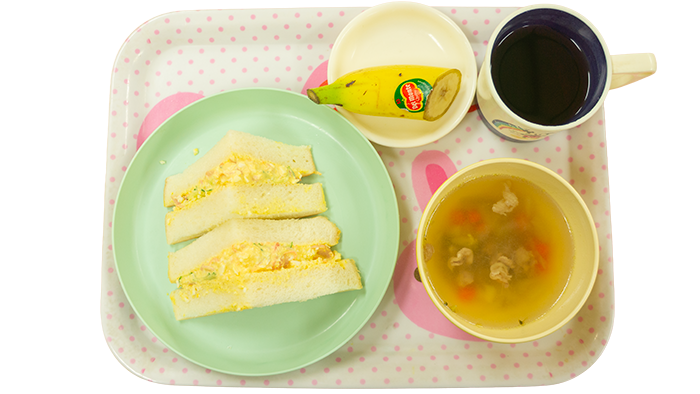 今日の献立は玉子サラダサンド、牛肉とキノコのスープ、バナナです。 幼児さんクラスの盛り付けです 乳児さんクラスの盛り付けです アレルギー対応メニューです -