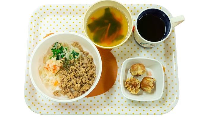 今日の献立はビビンバ丼、揚げしゅうまい、ワカメスープです。 幼児さんクラスの盛り付けです 乳児さんクラスの盛り付けです アレルギー対応メニューです -