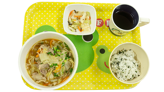 今日の献立は、カレーラーメン、わかめごはん、キャベツの昆布和えです。 幼児さんクラスの盛り付けです 乳児さんクラスの盛り付けです アレルギー対応メニューです -