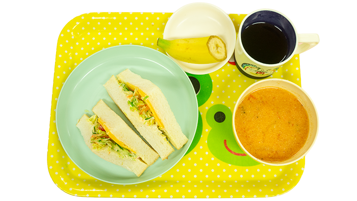 今日の献立はハムサンド、ミネストローネスープ、バナナです。 幼児さんクラスの盛り付けです 乳児さんクラスの盛り付けです アレルギー対応メニューです