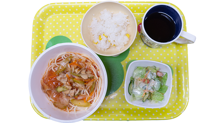 今日の献立はチキンとアスパラのトマトスパゲティ、コーンライス、グリーンサラダです。 幼児さんクラスの盛り付けです 乳児さんクラスの盛り付けです アレルギー対応メニューです -