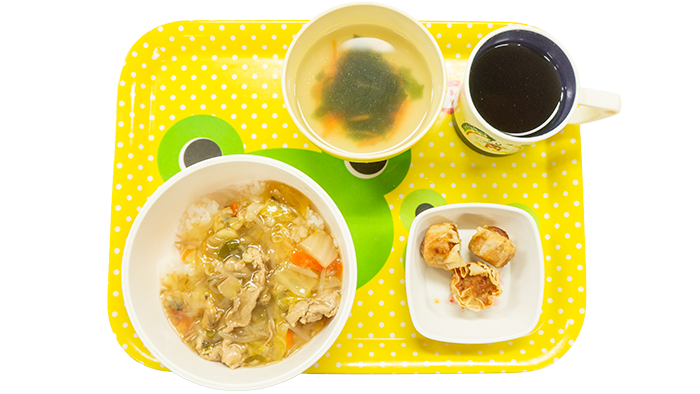 今日の献立は中華丼、揚げしゅうまい、ワカメスープです。 幼児さんクラスの盛り付けです 乳児さんクラスの盛り付けです アレルギー対応メニューです -