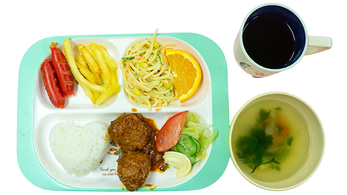 今日の献立はお子様ランチ(煮込みハンバーグ)です。 幼児さんクラスの盛り付けです 乳児さんクラスの盛り付けです アレルギー対応メニューです -