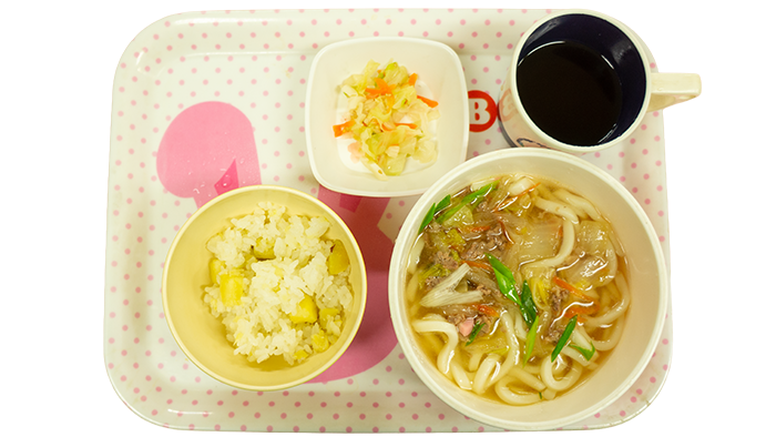今日の献立は肉野菜うどん、いもご飯、キャベツのごまあえです。 幼児さんクラスの盛り付けです 乳児さんクラスの盛り付けです アレルギー対応メニューです -
