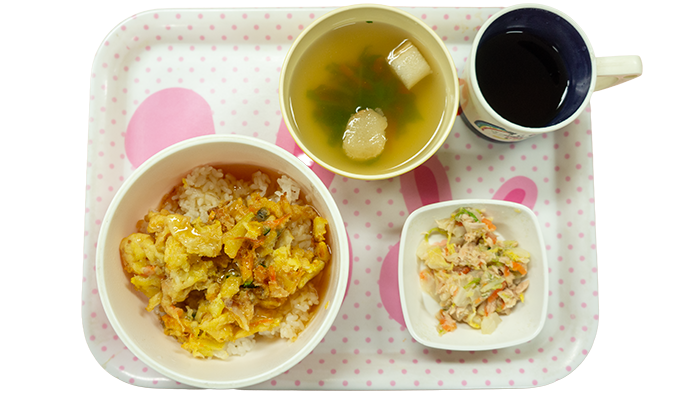 今日の献立はかき揚げ丼、白菜とツナの和え物、おふと水菜のすまし汁です。 幼児さんクラスの盛り付けです 乳児さんクラスの盛り付けです アレルギー対応メニューです -