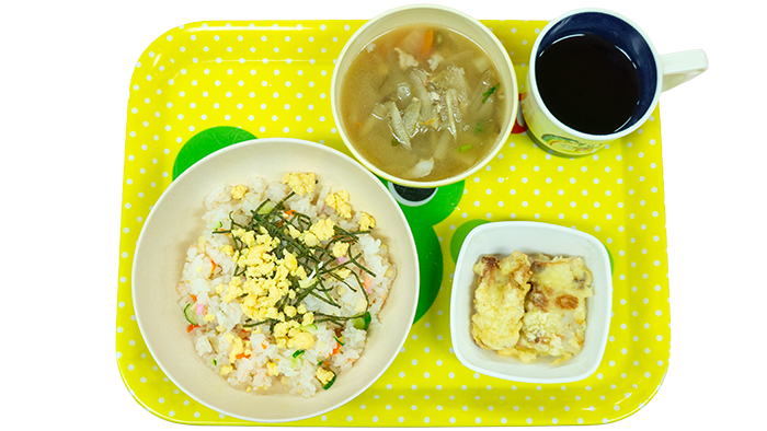 今日の献立は鮭ちらし寿司、ちくわの天ぷら、豚汁です。 幼児さんクラスの盛り付けです 乳児さんクラスの盛り付けです アレルギー対応メニューです -