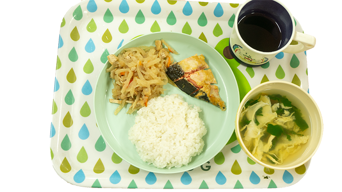 今日の献立は鮭の味噌マヨ焼き、切り干し大根の煮物、ごはん、ほうれん草と玉子のすまし汁です。 幼児さんクラスの盛り付けです 乳児さんクラスの盛り付けです アレルギー対応メニューです -