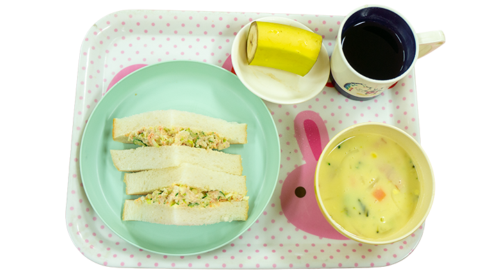 今日の献立はツナサンド、コーンチャウダー、バナナです。 幼児さんクラスの盛り付けです 乳児さんクラスの盛り付けです アレルギー対応メニューです -