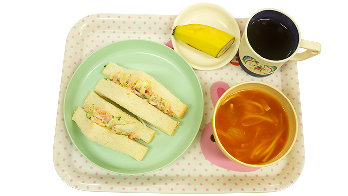 今日の献立はハムサンド、ミネストローネスープ、バナナです。 幼児さんクラスの盛り付けです 乳児さんクラスの盛り付けです アレルギー対応メニューです