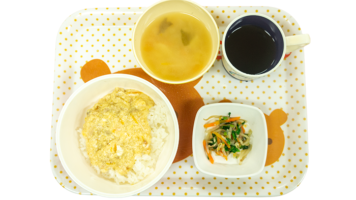 今日の献立は親子丼、ほうれん草ともやしの胡麻和え、じゃがいもと玉ねぎのお味噌汁です。 幼児さんクラスの盛り付けです 乳児さんクラスの盛り付けです アレルギー対応メニューです -