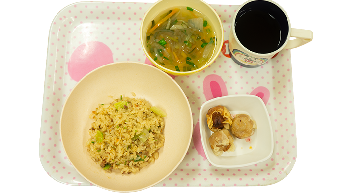 今日の献立はスタミナチャーハン、ミニ春巻き、青梗菜と春雨のスープです。 幼児さんクラスの盛り付けです 乳児さんクラスの盛り付けです アレルギー対応メニューです -