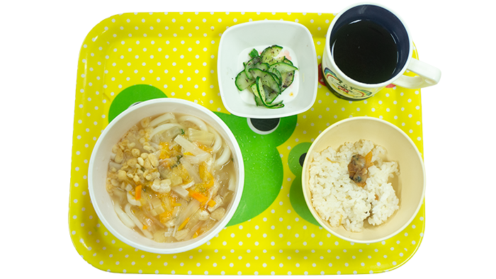 今日の献立は野菜あんかけうどん、あさりご飯、きゅうりのゆかり和えです。 幼児さんクラスの盛り付けです 乳児さんクラスの盛り付けです アレルギー対応メニューです -