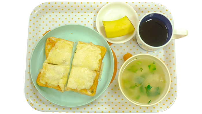 今日の献立はツナカレートースト、小松菜とパスタのスープ、バナナです。 幼児さんクラスの盛り付けです 乳児さんクラスの盛り付けです アレルギー対応メニューです -