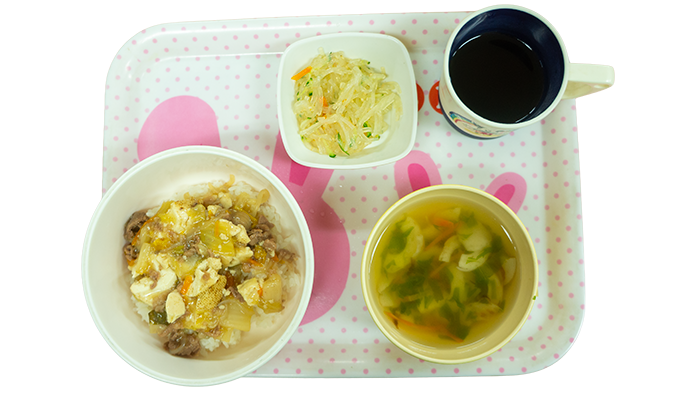 今日の献立はすき焼き丼、きゅうりと春雨の酢の物、水菜と竹輪のすまし汁です。 幼児さんクラスの盛り付けです 乳児さんクラスの盛り付けです -