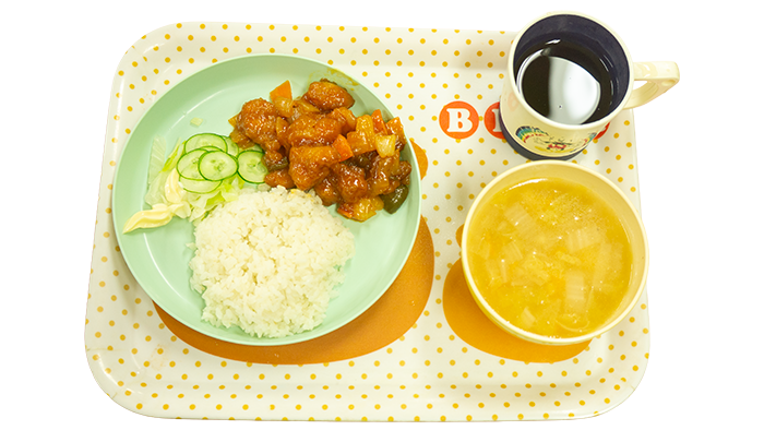 今日の献立は酢豚、温野菜、ごはん、豆腐と白菜の中華スープです。 幼児さんクラスの盛り付けです 乳児さんクラスの盛り付けです アレルギー対応メニューです -